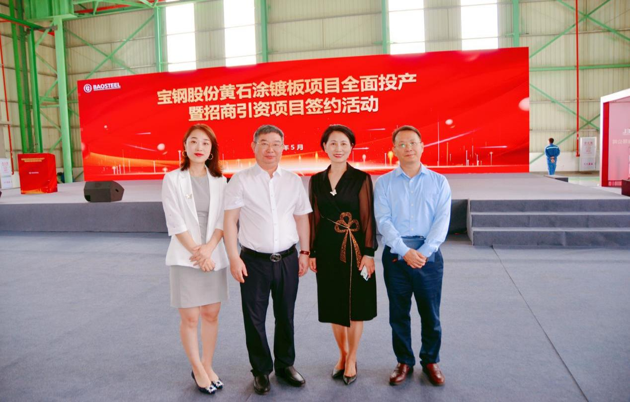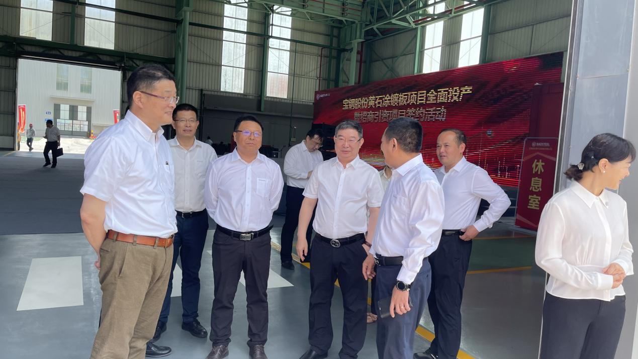 董事長劉國民和寶鋼股份黃石涂鍍板有限公司總經(jīng)理助理兼制造部部長劉浩洲(左三)